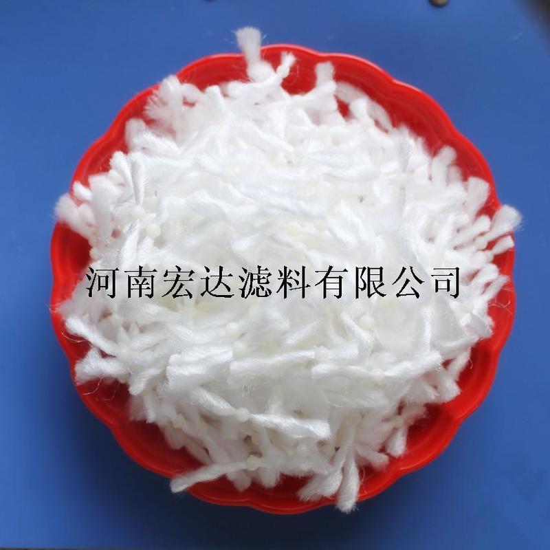 河南宏达滤料有限公司彗星式纤维滤料形象地说即为一颗颗粒状的丝束,象彗星一样拖着长长的“尾巴,该过滤材料的特点是一端为松散的纤维丝束,又称彗尾,另一端纤维丝束固定在密度较大的彗核内。过滤时,密度较大的彗核起到了对纤维丝束的压密作用,同时,又由于彗核的尺寸较小,对过滤断面空隙率分布的均匀性影响不大,从而提高了滤床的截污能力。它既有纤维滤料过滤精度高和截污量大的优点,又具有颗粒滤料反冲洗洗净度高和耗水量少的优点,是一种新型的过滤材料。
